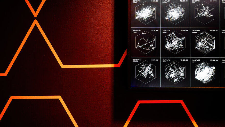 Absztrakt, vizuális formában kiolvasható belőle például, hogy egy adott napon hányan voltak a térben, és pontosan mikor voltak a legaktívabbak a látogatók. Ez egy izgalmas plusz réteg: az így keletkező adatok kontextusba helyezik a Hexagon világát. Maga a technológia is az adatvizualizációra épül, amely különösen közel áll hozzám. Legyen szó egzakt mérőszámokról vagy elvontabb mintázatokról, az adatok segítenek abban, hogy az immerzív tér működése érthetőbbé és „olvashatóbbá" váljon. A kávézóban a Flowlands esetében a mozgás inkább hangulatként jelenik meg, absztrakt vizuális nyelven, itt viszont információvá válik – adatokként, adatvizualizáció formájában –, sőt akár edukatív módon is. A közös pont mindkét esetben ugyanaz: a térben zajló mozgást tesszük láthatóvá, csak más nyelven.