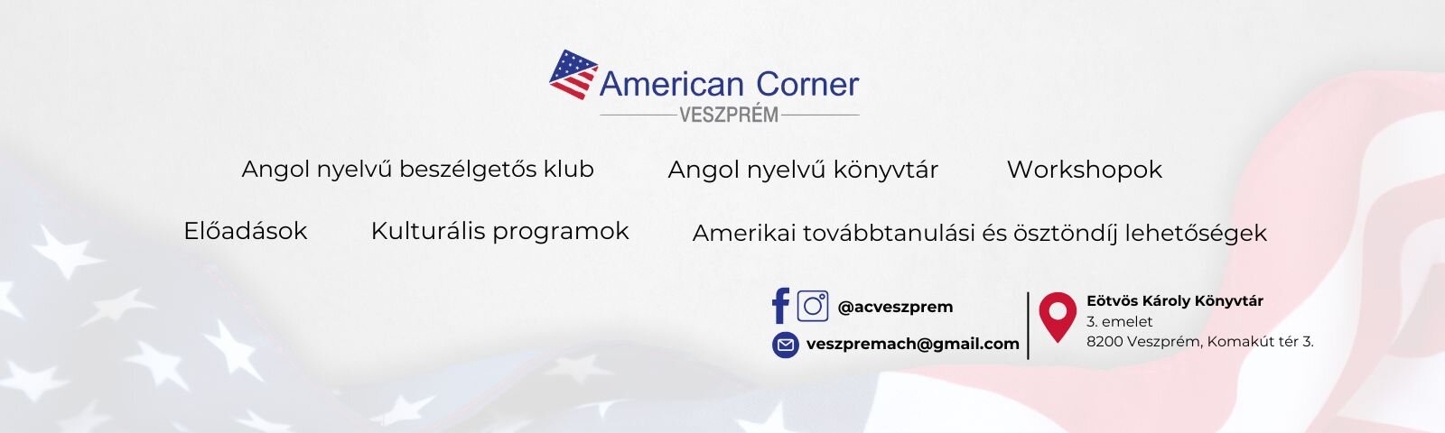 Az American Corner Veszprém az Eötvös Károly Könyvtár 3. emeletén található közösségi tér, ahol az érdeklődők ingyenes, angol nyelvű, az Egyesült Államok kultúrájához kapcsolódó programokon vehetnek részt, illetve kölcsönözhetnek angol nyelvű könyveket. A Corner egyben EducationUSA tanácsadó központ is, így azoknak akik az Egyesült Államokban szeretnének továbbtanulni ingyenes tanácsadást és segítséget tudunk nyújtani.